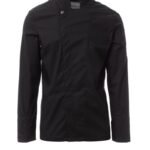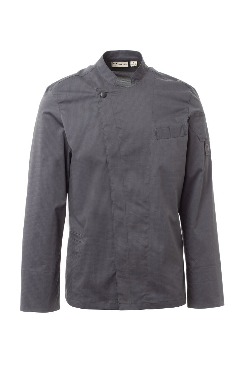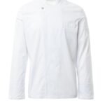 Chaqueta de cocina para hombre con cuello mao, confeccionada en ripstop de algodón y Lycra® T400®, con excelentes propiedades elásticas y transpirables, y con un cómodo tejido de malla en la espalda, en el largo interior de la manga y bajo la sisa para una mayor transpirabilidad. Cierre cruzado con botones automáticos. Manga larga con puño vuelto. Emblemático parche contorneado en el hombro izquierdo, con bordado de hélice tono sobre tono, con pequeño bolsillo para bolígrafos. Bolsillo pequeño a la altura del pecho y práctico bolsillo para el teléfono móvil en la cintura.