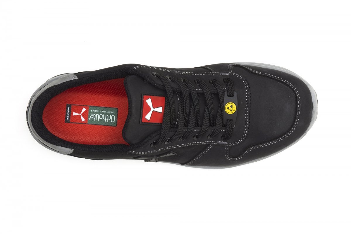 Zapato de seguridad antiestático bajo de hombre, pala de piel repelente al agua y transpirable, forro interior (en toda la superficie interna) transpirable y resistente a la abrasión, 6+6 ojales sin metal, protector de tacón en grano técnico con inserción reflectante, puntera de aluminio moldeado a presión, plantilla extraíble Ortholite X40 016, plantilla de lámina textil certificada antiperforación, cambrillón antitorsión, base de la puntera con forma de herradura, entresuela de poliuretano ultraligero, amortiguador MASTER BALANCE en PU poliéter de alta tenacidad y densidad equilibrada, suela XTRAIL GRIP en TPU con protector de tacón y de punta.