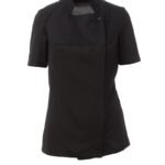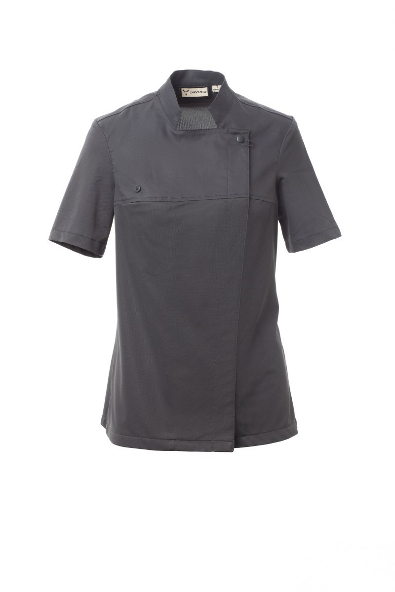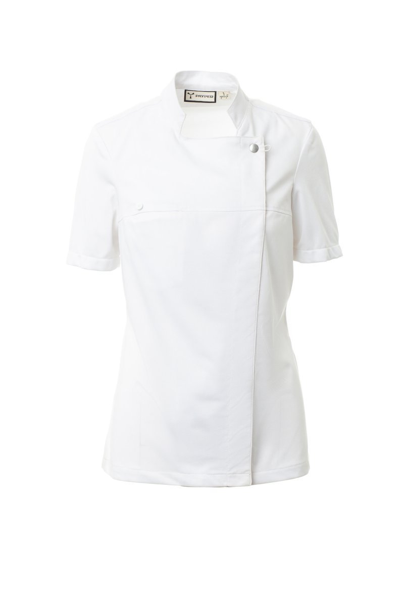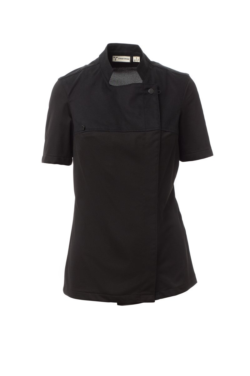 Chaqueta de cocina para mujer con cuello mao, confeccionada en twill de algodón y Lycra® T400®, con excelentes propiedades elásticas y transpirables, y con un cómodo tejido de malla en espalda, mangas y cintura para una mayor transpirabilidad. Cierre cruzado con botones automáticos, la solapa se puede doblar y sujetar al pecho mediante un botón a la vista, creando el efecto de una solapa sastre y un innovador escote en pico. Manga corta con ribete.