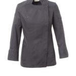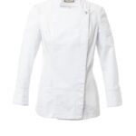 Chaqueta de cocina para mujer con cuello mao, confeccionada en twill de algodón y Lycra® T400®, con excelentes propiedades elásticas y transpirables. Cierre cruzado con botones automáticos, la solapa se puede doblar y sujetar al pecho mediante un botón a la vista, creando el efecto de una solapa sastre y un innovador escote en pico. Manga larga con puño con botón automático a la vista. Emblemático parche contorneado en el hombro izquierdo, con bordado de hélice tono sobre tono, con pequeño bolsillo para bolígrafos. Práctico bolsillo para teléfono móvil en la cintura. Aberturas verticales en el bajo de la espalda para facilitar el movimiento.