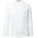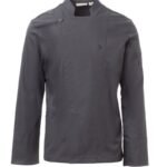 Chaqueta de cocina para hombre con cuello mao, confeccionada en twill de algodón y Lycra® T400®, con excelentes propiedades elásticas y transpirables. Cierre cruzado con botones automáticos, la solapa se puede doblar y sujetar al pecho mediante un botón a la vista, creando el efecto de una solapa sastre y un innovador escote en pico. Manga larga con puño vuelto, refuerzo de tejido de malla bajo la sisa para facilitar la transpiración. Emblemático parche contorneado en el hombro izquierdo, con bordado de hélice tono sobre tono, con pequeño bolsillo para bolígrafos. Práctico bolsillo para teléfono móvil en la cintura. Aberturas verticales en el bajo de la espalda para facilitar el movimiento.
